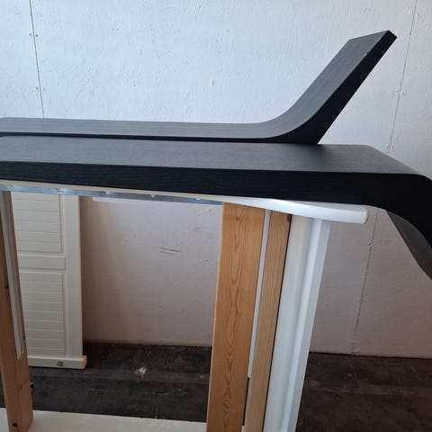 1 stk sort tynn hylle 20cm x 50 cm og 1 stk 20cm x 60cm med knekter. Den minste hylla har skrapemerker. Kr 200.