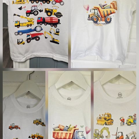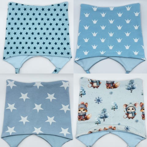 Bomullsluer sydd av meg. Okergul lue er foret med ull. Mot et tillegg i pris, kan jeg stryke på barnets navn med refleksvinyl.