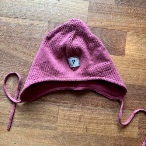 Polarn O. Pyret lue i størrelse 2-9 år for barn. Luen er rosa med hvite striper og laget av en blanding av 50% akryl og 50% merinoull. Vindtett og refleksbånd, samt øreflapper