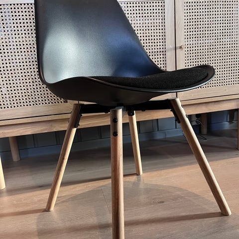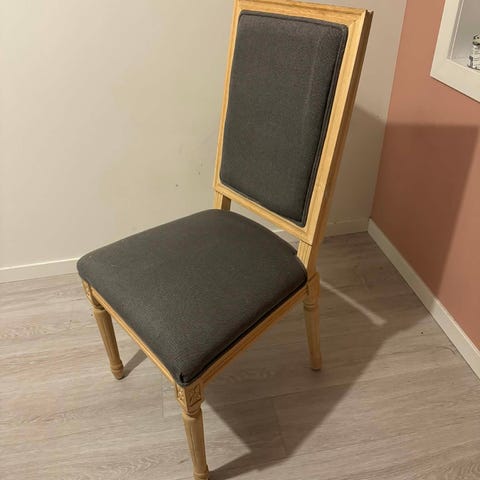 Selger 4 spisestoler til 400,- pr stol. Selges kun samlet. Stolene har litt bruksmerker. Beina er i hvitbeiset eik. Veldig gode å sitte i.