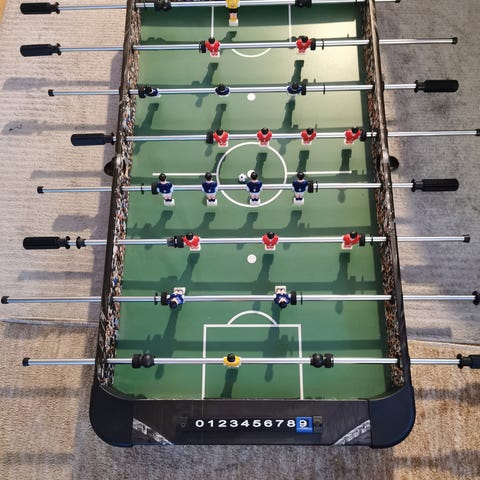 Selger et pent brukt bordfotballbord. Står stødig og fungerer som det skal. Alle stenger, spillere, fjærer og håndtak er hele. Noe normal bruksslitasje på spilleflaten, men ingenting som påvirker spillopplevelsen.