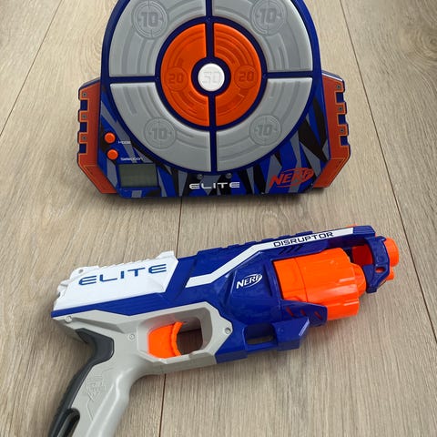 Nerf blaster med tilhørende beskyttelsesmaske. Blasteren er i oransje og hvit farge, designet for lek og spill. Masken har justerbar stropp for tilpasning og gir beskyttelse under bruk.
