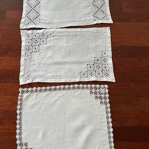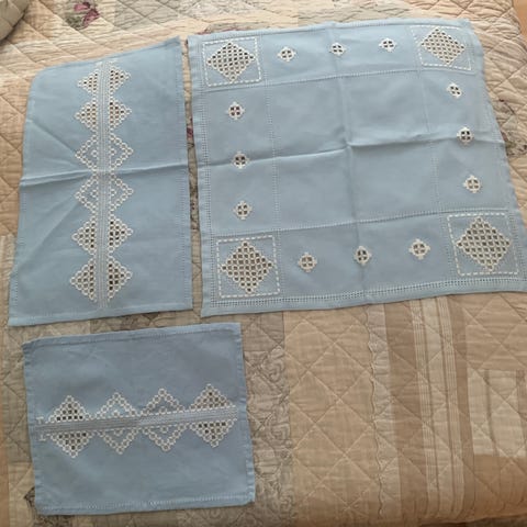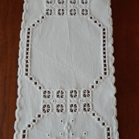 Pent utført hardangersøm på lyserosa bomull.