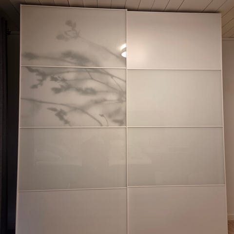 Skyvedørene er hvite med skygge av greiner, se bilde.