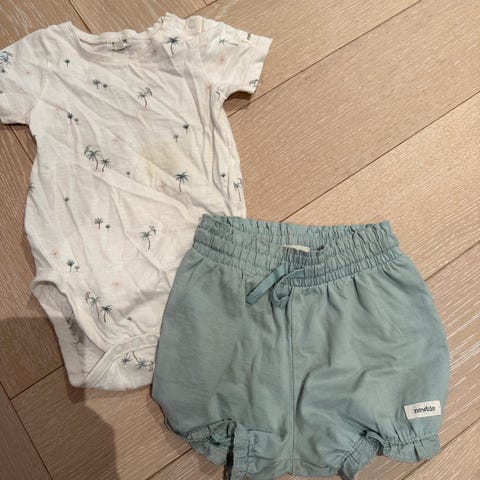 Pent brukt sommerlig sett fra newbie str 86 (12-18 mnd), bukse i 100% lin, skjortebody 100% bomull. Supersøtt print med 🦖 på bodyen.