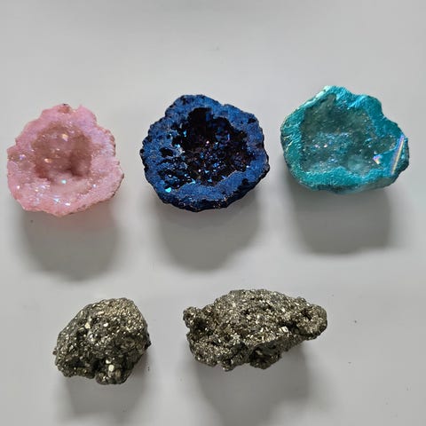 To krystalltrær selges samlet. Den hvite er av sorten klar kvarts og den grønne er grønn aventurin.