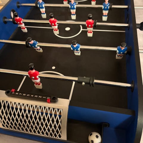 Bordfotballspill med motiv av en fotballstadion på sidene. Spillet har svarte ben og standard spillestenger med svarte håndtak. Passer til innendørs bruk for underholdning.