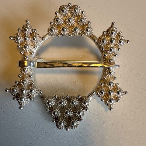 Halsring (bunadsølv) med gravert dekor og detaljer i filigran. Ansvarsmerket for Sylvsmidja. Har dessverre en knekt bit (se bilde 2). Ikke særlig synlig ved bruk, men selges derfor billig. Koster 3270 kr ny.