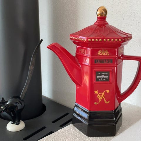 Dekorativ TEBOKS med plastlokk dekorert med engel og teksten «The de Qualiè»