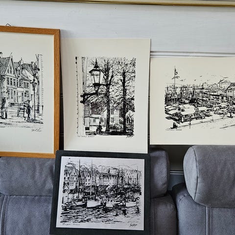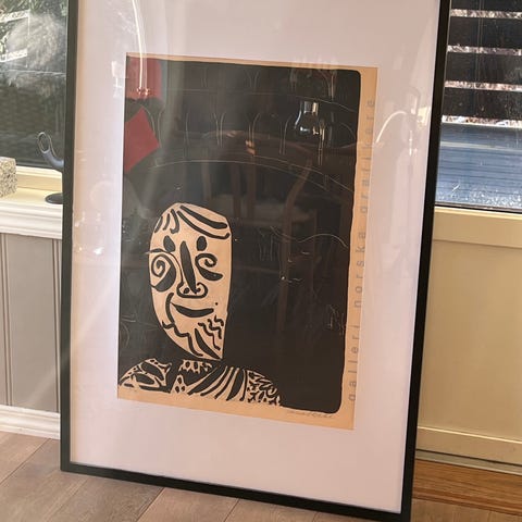 Flott lito av Sverre Hjertnes. Dette har hengt i en bankfilial i mange år. Stort og stemningsfullt, vakkert innrammet. Kjøpt inn av konservator i sin tid. Bør sees. Modernistisk preg. Kan se at det er brukt penger på innramming og passepartout.