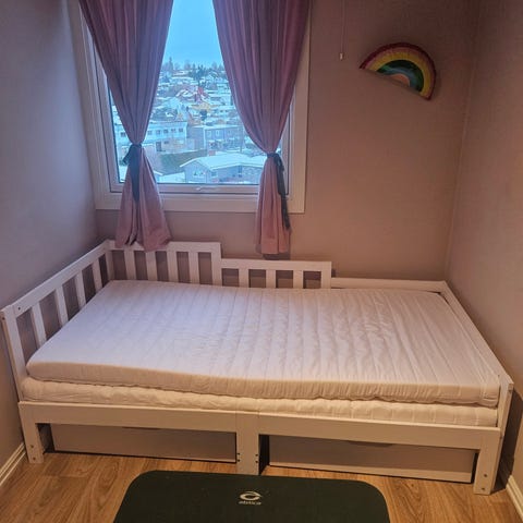 90x200 seng med madrass, hvitt med tre detaljer