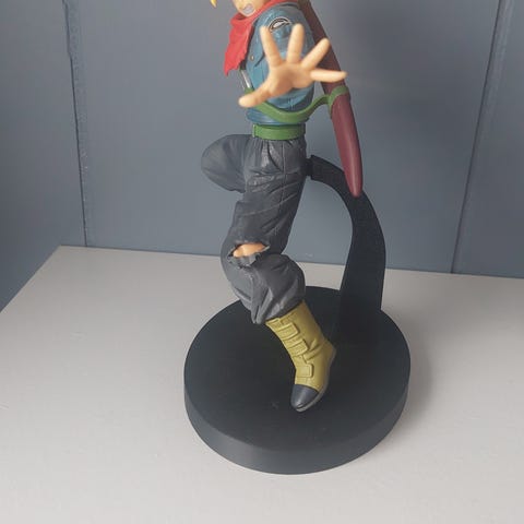 Krillin actionfigur med effektbase. Figuren viser karakteren Krillin i en kampstilling med gul effekt som simulerer energi eller angrep. Figuren er montert på en svart stativbase for støtte og visning.