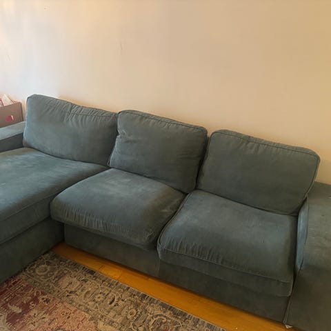 Godt brukt sofa fra IKEA med puff. Litt kloremerker fra katt og litt flekker. Trekk kan tas av og vaskes på 60 grader.