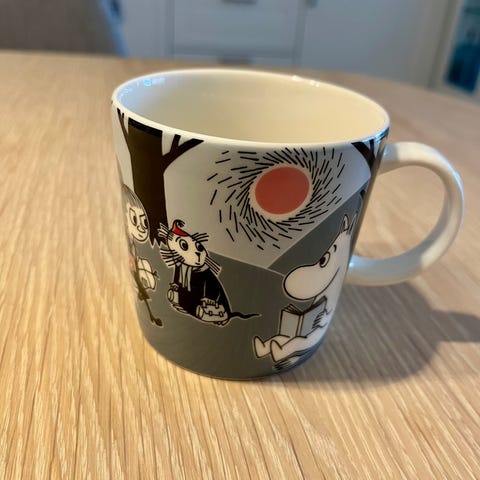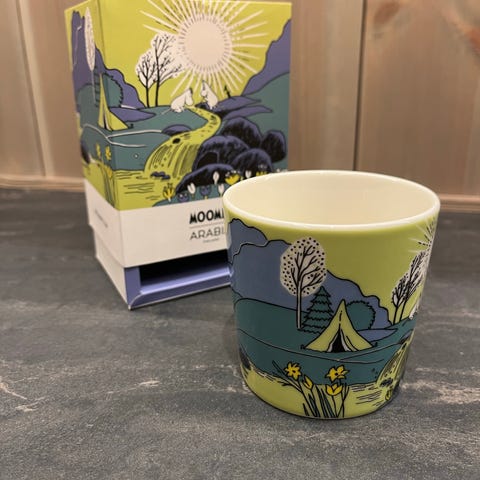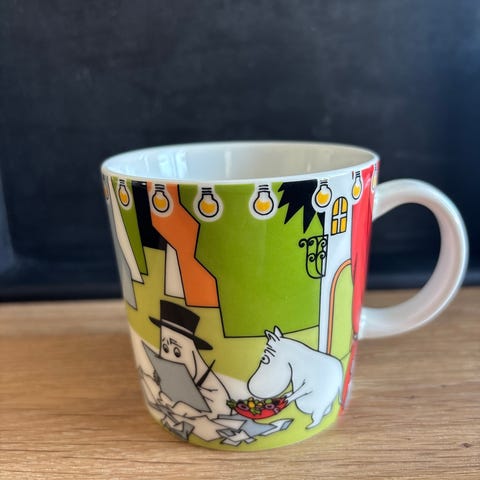 Arabia Moomin kopp med Mummi-motiv. Koppen har fargerike illustrasjoner av Mummifigurer og er laget av keramisk materiale. Passer til daglig bruk som drikkekopp.
