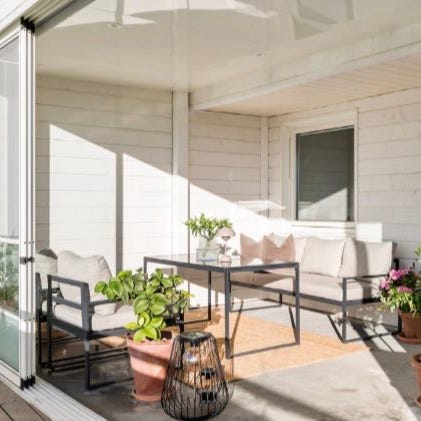 Nyt late sommerdager på balkongen eller i hagen med dette elegante settet. Settet består av to komfortable stoler, to matchende fotskamler og et lite bord.
