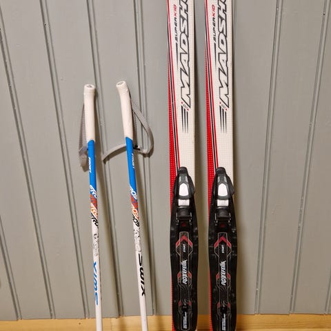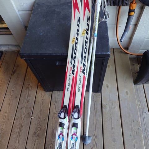 Madshus smørefri ski på str 110 cm selges med staver i 90 cm. Kan selges hver for seg om ønskelig.