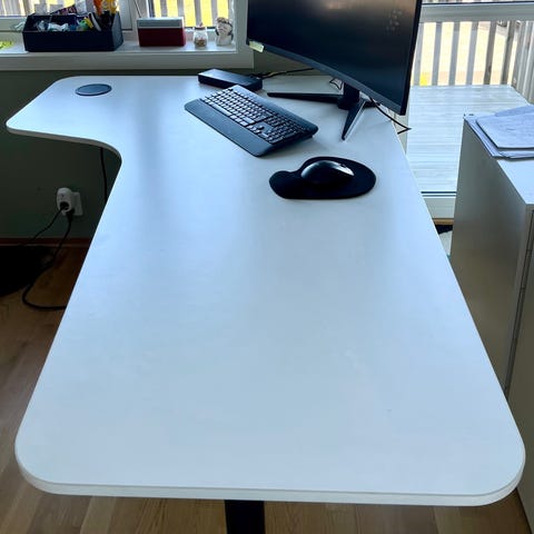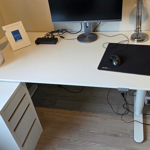 Pult fra IKEA med mulighet for å justere høyde. Under bordplaten er en nettingkurv for ledinger.