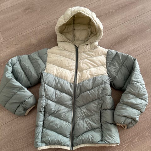 Fin lyseblå dunjakke fra Cubus. Litt liten i str. Avtakbar hette, 2 stk lommer.
