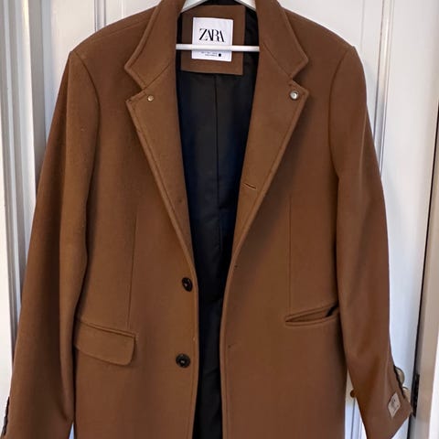 Zara kåpe i brun farge, størrelse S for herre. Laget av ullmateriale. Kåpen har to lommer foran og enkelt knappelukking. Jeg har bare brukt den 2 ganger.