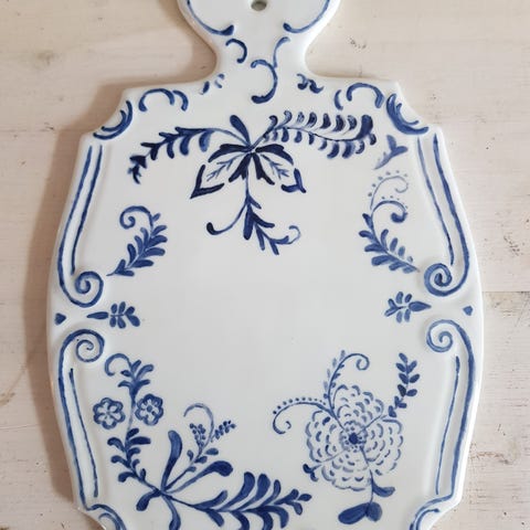 Jeg er usikker på bruken av denne. Kanskje det er et dekorelement til ei dør eller lignende. Kan brukes som skjærefjøl på den glatte siden.