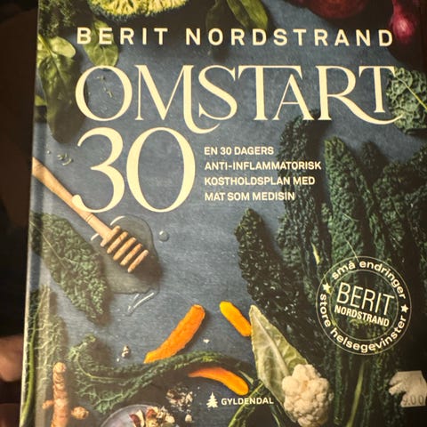 Berit Nordstrand Omstart 30 bok. Inneholder en 30 dagers anti-inflammatorisk kostholdsplan med mat som helbreder.