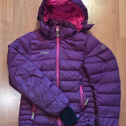 Bergans dunjakke for jente i størrelse 140. Jakken er blå og laget med dun som materiale, egnet for barn.