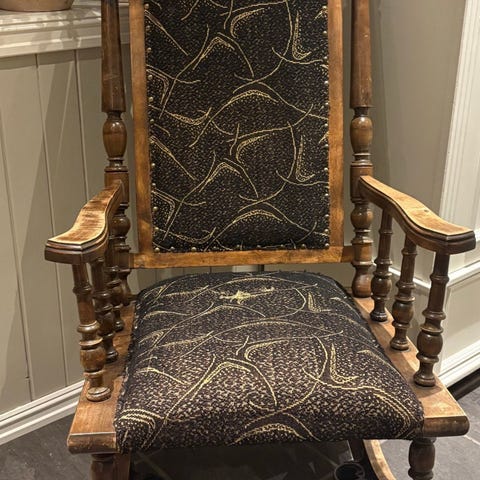 Nydelig gyngestol som står stødig på gulvet. Hel i stoffet, kan trekkes om hvis ønskelig.
