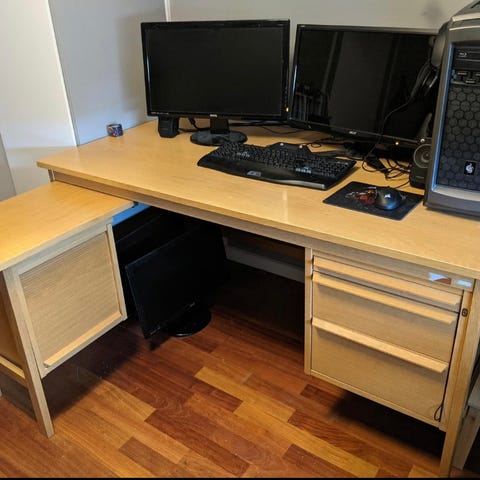 Selger dette kjempefine skrivebordet da vi har kjøpt et litt mindre til kontorplassen hjemme. Liten skuff for oppbevaring foran. Bordet er lite brukt, men har fått et par små kaffekoppmerker, se bilder. Derav redusert pris.
