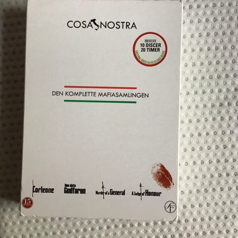 Cosa Nostra Den komplette mafiasamlingen DVD inneholder 10 disker med filmer fra Mafiahistorier, inkludert titler som Guds fiender, Morderen i generalen og Andre æresordrer. Samlingen gir en omfattende oversikt over ulike aspekter av mafiaens verden gjennom flere filmer.
