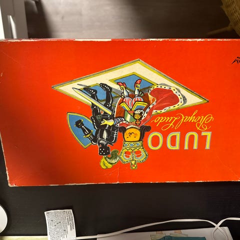 Esken er 28 cmx20 cm. Brett, og spillebrikker i tre er i god stand. Esken er slitt med tape i hjørner.