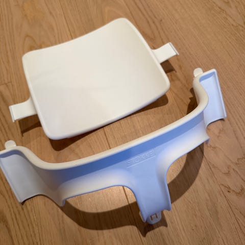 Tilbehør til Stokke Tripp Trapp, inkludert brett, baby set og sikkerhetssele.