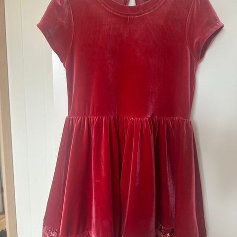 Røde Kjoler i størrelse 110, fra Name it og Lindex. Kjole fra Name it med korte ermer, polyester (fløyel) med røde paljetter. Kjole fra Lindex med lange ermer, rødt stoff med paljetter på overkropp og tyllskjørt.