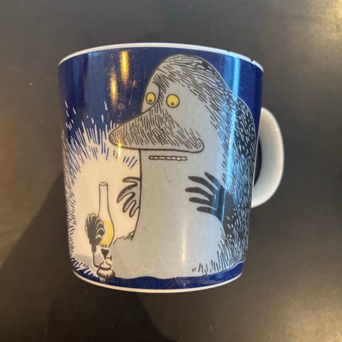 Arabia Mummitrollet kopp med illustrasjon av Mummimamma. Koppen er laget i keramisk materiale og har en blå bakgrunnsfarge. Egnet for daglig bruk i kjøkkenet.