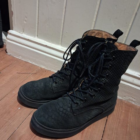 Selskinnstøvler i str 36 selges billig pga en revnet søm bak på den ene støvelen . Kan sikkert limes eller syes . Ellers er støvlene helt fine og sålen er ikke slitt . Supervarme og gode .