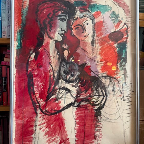 Abstrakt maleri med bymotiv, preget av sterke farger som rød, gul og svart. Maleriet er innrammet og signert, med tydelige detaljer av bygninger og et skip. Passer til dekorasjon i ulike rom. Bildet er kjøpt i Brasil 2005.