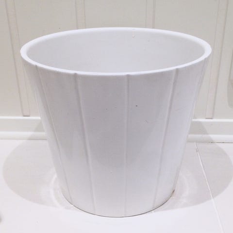 To hvite blomsterpotter med ulik tekstur på overflaten. Den ene har en glatt, bølget design, mens den andre har vertikale riller. Begge pottene har en rund form.