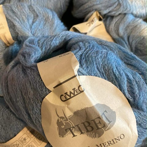 Cewec Tibet garn i blå farge. Garnet består av 24% yak, 55% merinoull og 21% polyamid.