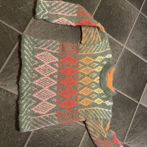 Fossveien-genser (design Inga Semmingsen/vippet av pinnene). Tror denne er strikket i Hillesvåg Sølje selv om originalen er i Tinde. Tynn og ikke for varm!
