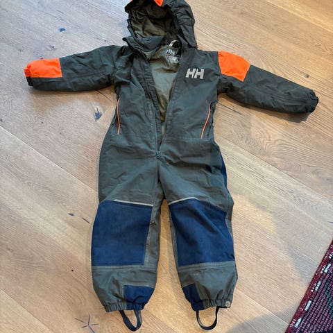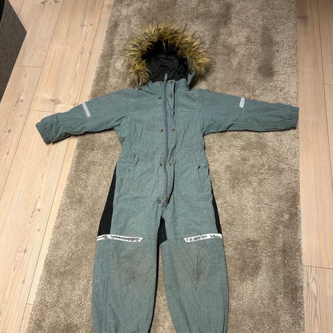 Wheat vinterdress i blå farge, størrelse 104 for barn, unisex modell. Laget av polyester materiale. Dressen har en hette med pelskant. Merk at plagget har synlige slitasjer og hull på bena, som vist på bildene.