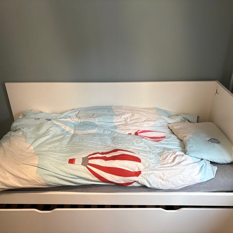 Pent brukt, ca 4 år gammel. Har to små merker hvor malingen har løsnet. To madrasser følger med, kan også legge til en overmadrass for 200 kr ekstra. Må hentes, selges delvis demontert. Bruksanvisning følger med.
