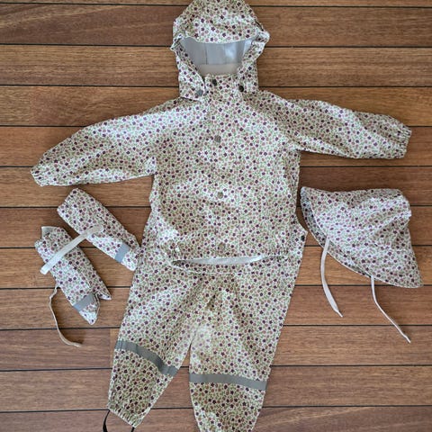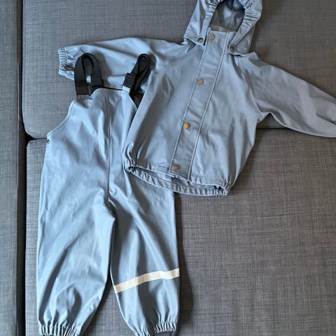 Foret regnsett fra kuling i størrelse 86/92. God i størrelsen, settet er brukt godt ut i str 98. Setter er inntakt med stropper, og ingen rifter eller slitasje på typisk knær/rumpe. Perfekt til kalde, våte dager.