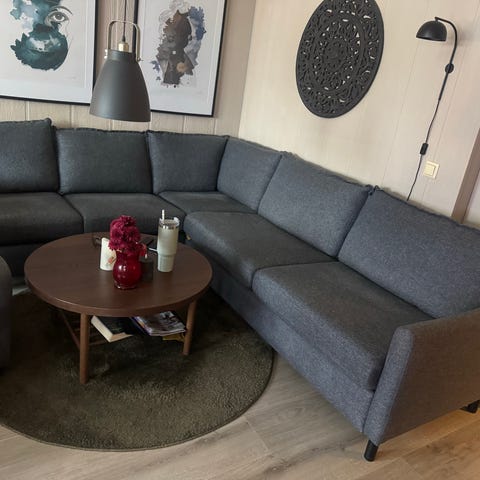 Sofa mål : 3,96×3,96m. Sjeselong venstre side 2,30m. Sjeselong høyre side 1,5m. Høyde 85 cm+nakkestøtte. Sofaen er pent brukt, men noe skjolder etter sola.