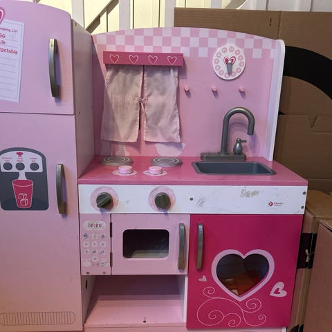 Lekekjøkken. Mangler stang til å henge opp tørkerull. Knekt luke til oppvaskemaskin. På den øverste døren er stopperen knekt. Kjøkkenet må hentes. Kjøkken utstyr medfølger dersom ønskelig.