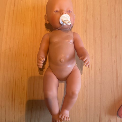Pent brukt dukke som trenger ny bleie. Smokk mangler. Kjolen er håndlaget av en 5 år gammel jente av filler – veldig sjarmerende!