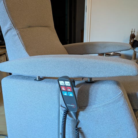 Veldig god stol som også hjelper deg og få deg opp på beina. Allt kjøres eletrisk.