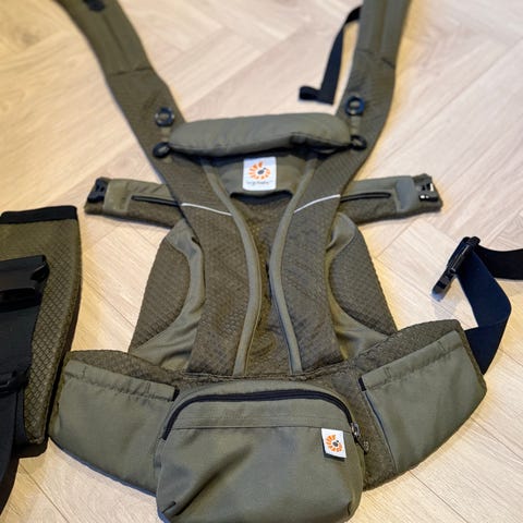 Ergobaby bæresele i grå farge. Designet for å bære baby komfortabelt og trygt. Justerbare stropper og polstret for brukervennlighet og støtte.
