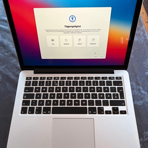 Apple MacBook Air laptop med 13,3 tommers skjerm, Intel Core i5-prosessor, 8 GB DDR3 RAM og 256 GB lagringsplass. MacBook Air kjører operativsystemet macOS Monterey versjon 12.7.6. Modellen er fra 2017.