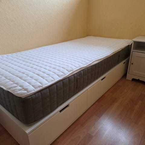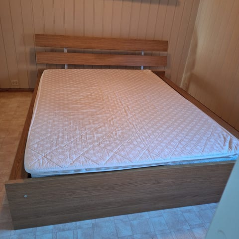 Seng selges pga plass. Fin og behagelig madrass, overmadrass følger med hvis ønskelig. Må hentes