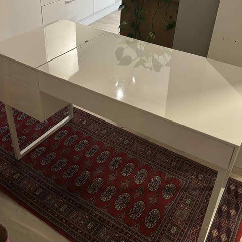 Pent skrivebord til salgs. Det er kjøpt på Skeidar for mange år siden. Bare stått på gjesterom. Selger da jeg trenger plass til barneseng til barnebarn. Den øverste delen er løs. Målene på den er 11 cm høy og 27 cm dyp.. den har to store skuffer i front og to små på den øverste delen. Pris kan diskuteres.