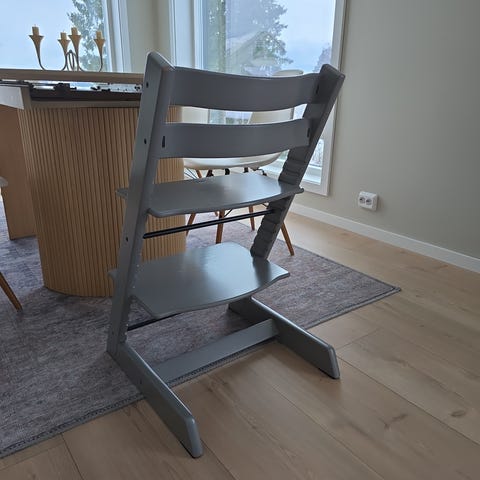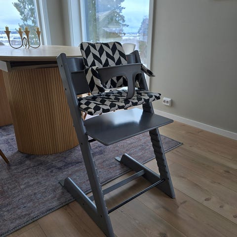 Stokke barnestol i hvit. Barnestolen er laget av tre og har justerbare seter og fotstøtte for tilpasning etter barnets størrelse. Stolen har noen merker etter egg og bøyle, se bilder. Det er monter stopper bak på bena så den ikke skal kunne velte bakover.